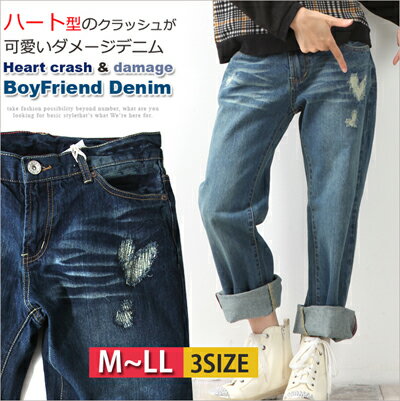 これがあればトレンド感溢れるデニムスタイルが即完成! ロールアップしてクロップド丈で 履くと足元がすっきり! レギンスなどのレイヤードも愉しくお洒落できまよ! ●キュートなハートデザインでも、ダメージ加工やヴィンテージ加工のカッコよさ、 ボーイフレンド特有のルーズ感などメンズライクな一面があるから 、 甘すぎずクールな演出もオマカセのジーンズボトムスです★
